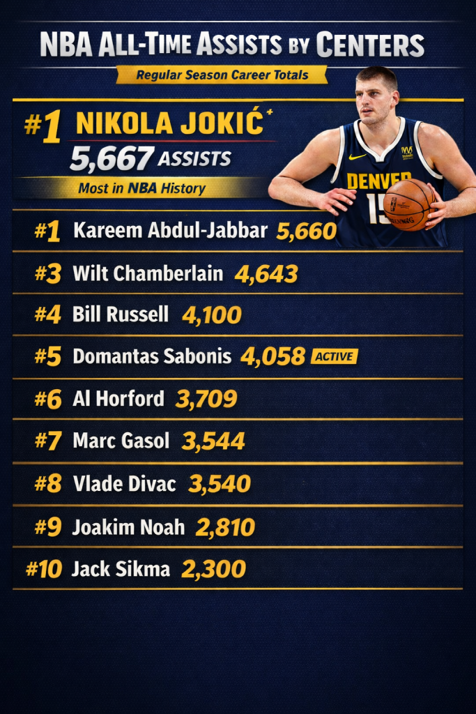 This week, Jokić passed Kareem Abdul-Jabbar on the all-time assist list for centers. Of course, he did it in far less time. He also currently sits 50th all-time in NBA history among all players, regardless of position, in regular-season assists. He also holds the record for most assists in a season by a center, with 716 in the 2024–25 season.